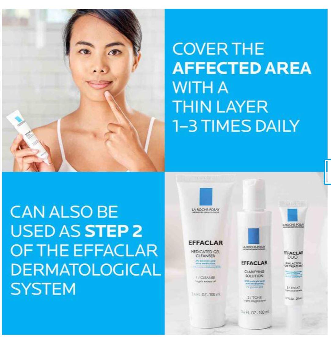 5.5% Benzoyl Peroxide: A common and effective acne ingredient with fast acting properties. Effaclar Duo uses micronized benzoyl peroxide; milled to a consistent small size that allows for deep penetration into the pores. An ideal choice for those concerned with red, raised acne blemishes and pimples.
